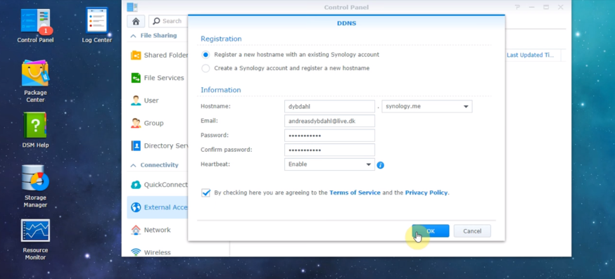 In the DDNS screen, you will see the option to choose a service provider at the top. Choose Synology and click on 'register'. You will now have the option to log in with an existing account or register a new one. Below that are all the fields where you can fill in your account details (see screenshot). Finally, you must accept the terms and can set up your Synology account on your computer.