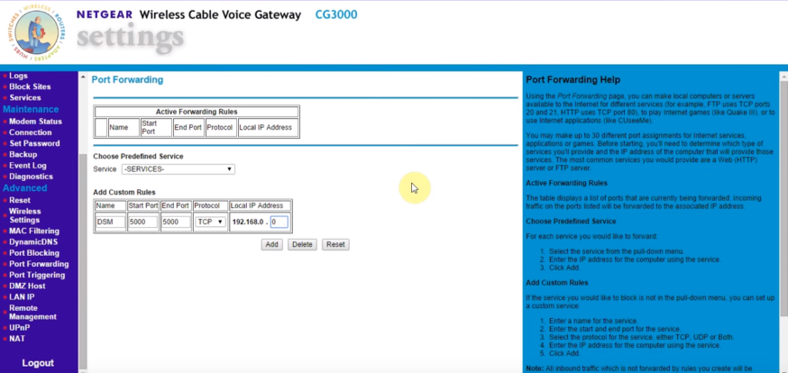Then look for the option 'Port Forwarding' on this page. This may be easier to find on some routers than others. As you can see in the screenshot, you can fill in the details you looked up earlier. In this example, you can see how to set up a DSM port.